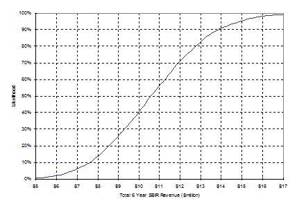 Value at Risk – Total SBIR contract revenues (4 application per quarter). The curve on the value at risk chart gives the likelihood that the contract revenue lies below or above the target values given on the horizontal axis. Risk profiles are ideally suited to convey the variance associated with the contract revenue. For example, on the chart below, the likelihood of total SBIR revenues less than $6M is approximately 30% and the likelihood of more than $6M is approximately 70%.