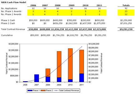 We begin with a functionally valid model of cash flow generation from SBIRs over time. The following is a static, logical model of cash flow generation through SBIR awards. An SBIR grant is typically divided into Phase 1 and Phase 2 (there is possibility for follow-on funding, however the intricacies will not be covered here), worth $100k and $750k respectively. Historical data is in the public domain enables us to estimate the likelihood of attaining a Phase 1 and subsequent Phase 2. The likelihood of a successful Phase 1 award is approximately 25% and Phase 2 is 50%.