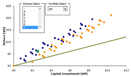 The discrete portfolio investment vs return plot can be used to build executive intuition for project interdependencies and the optimum mix of projects. An interactive dashboard is a good way to ‘get to know’ the model – this can be done directly in Excel using ‘Form’ controls or using custom dashboard software e.g. Crystal Xcelcius that sits on top of the Excel model.