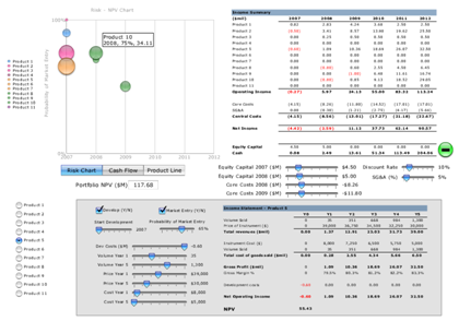 With this portfolio tool executives can control a range of input parameters and immediately see the effect on the portfolio. The bottom section allows the user to select different product proposals and explore key uncertainty drivers and decisions e.g. should we develop product, when do we start, what happens if development costs are exceeded, first year volumes are lower than expected, cost of goods are higher etc. There is a standalone product income statement, which feeds into the portfolio income statement and cash model. As the portfolio decision space is explored the executive can monitor cash position, total NPV and adjust other parameters such as level of capital investment. The entire management team participates to input their knowledge e.g. sales may have a good idea of the first year volume potential, manufacturing can provide bill of material cost spreads. The results are displayed instantaneously and the team becomes sensitised to how their project fits within the context of the portfolio or company performance, which can help to reduce ‘silo’ mentality.