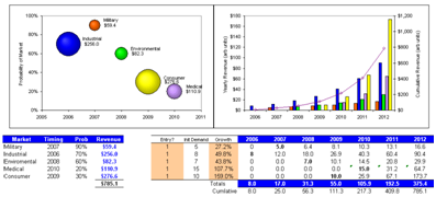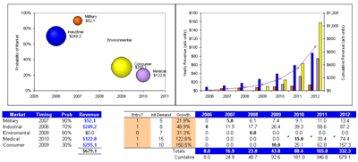 The ‘bubble’ chart is a good conceptual way to grasp the value, risk and timing associated with a range of applications. The challenge is to embed this into a revenue model that logically captures the structure and information contained within the ‘bubble’ chart.