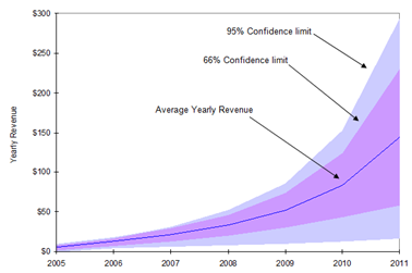 The model illustrated below is logically correct; however the revenues figures are arbitrary numbers. It is useful to illustrate the Monte Carlo approach.