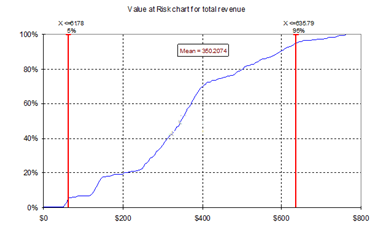 The Value at Risk chart gives the probability of the realised revenue being greater or less than the revenue value on the horizontal axis. The chart below shoes the VAR for a single product, it is clear that there can be significant variance in the returns, which in reality would be compounded farther by the fact that a product with unsuccessful market entry would yield an overall loss.