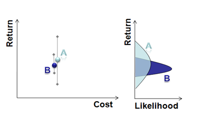 Between these extremes we can continuously vary the plot of return and cost. It is also very straightforward to add likelihood figures to the plots to show the executive that the extreme values are less likely than the average values; they are getting all the information about the underlying distribution but the representation and output is more accessible.