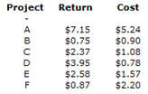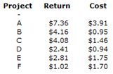 In this instance Project A has a return of $7.36M and cost of $3.91M, Project D had a return of $2.41M and cost of $0.94M; they are independent so the portfolio selection of Project A and D has an overall return of $9.77 and cost of $4.85M. In this instance the combination of A and D is no longer the optimum portfolio for this level of investment.