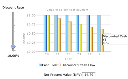 At a 10% discount rate a dollar in year 5 is worth 62 cents in today’s money