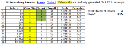 The model simulates the coin flipping and payout for a streak of heads. You can get a feel for what you would pay to take the bet; you can run it with a Monte Carlo package to get the payoff distribution. The screenshots below show three different runs where there is a streak of 4, 5 and 6 heads with a payout of $15, $31 and $63 respectively.