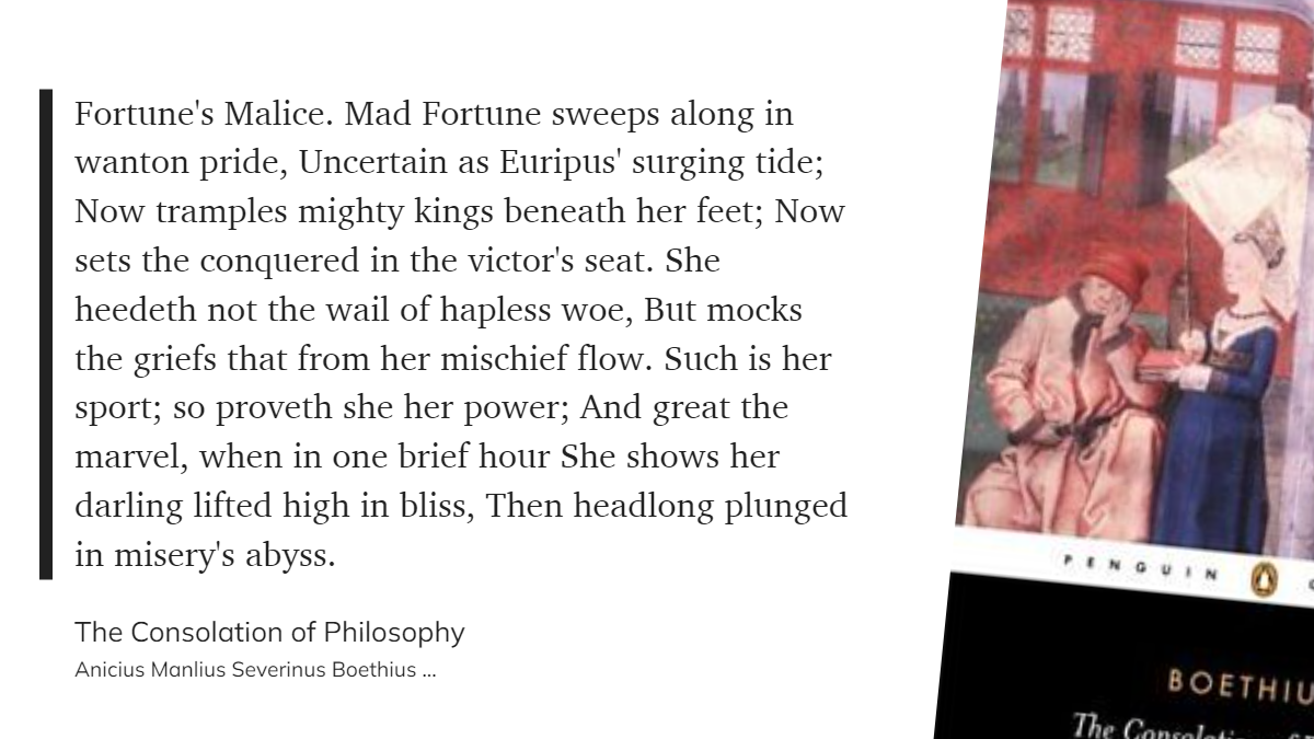Boethius’ philosophy also encourages a long-term perspective. The Wheel of Fortune keeps turning, which means that even if you’re at the bottom now, things can always change for the better – understanding that failure is often a stepping stone to success (sadly it didn’t end so well for poor Boethius He was tortured and executed in 524).